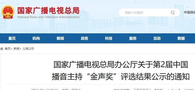 国度播送电视总局2024年3月12号上昼09:33,在官方网站上发布了题为《国度播送电视总局办公厅对于第2届中国播音主抓“金声奖”评比效用公示的见知》。见知对拟赢得 第2届“金声奖”的播音员主抓东谈主进行了公示,底下就让咱们沿路来轻柔一下: